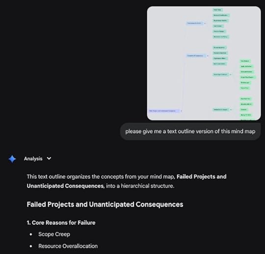 In my case, I’m trying to see the key ideas in a collection of texts all about “unanticipated consequences.” I added several UC texts to my NotebookLM and then clicked on “Mind Map.” It created this lovely chart with the major categories that it saw in my texts… (click on the image to see the full thing):