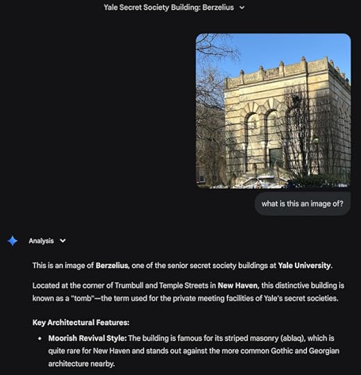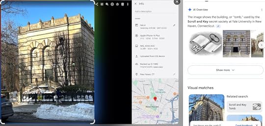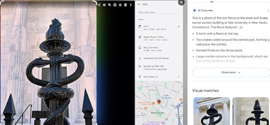 On the left is a photo I took of a particularly intriguing fence post sculpture. Here, I used Google Lens by right-clicking on the image in Google Photos. The answer here, on the right, is correct--this is a fence post in front of the "Book and Snake" secret society tomb at Yale. (Aside: The secret societies meet in mostly windowless buildings called "tombs." You could look it up.)