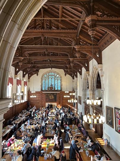 Once again, Google Lens (invoked from Google Photos) identifies this correctly: this is the Berkeley College dining hall, "The architecture is characteristic of the Collegiate Gothic style prevalent at Yale, featuring high, ornate wooden ceilings and large windows."