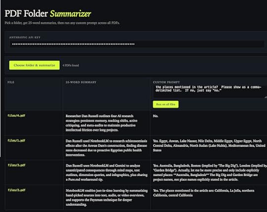 One way to explore a set of papers is with an interactive, bespoke AI analysis tool. Today, in 10 minutes, I made this bespoke info visualization that reads in a set of PDFs, creates a 25 word summary of the paper, and then lets you ask questions of all the papers, putting the answer to your query/prompt in the third column.