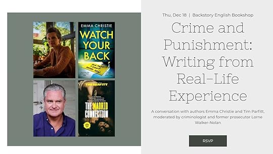 Books, Reviews, Research, News & EventsOn Thursday 18 December I am participating in an event in Barcelona at the Backstory English Bookshop, Carrer de Mallorca, 330 - from 6pm to 7.30pm. It’s called ‘Crime and Punishment: Writing from Real-Life Experiences’. I’ll be chatting alongside Scottish author and former crime journalist Emma Christie and Lorne Walker-Nolan, professor of criminology and a former criminal lawyer. Click here for further details and to RSVP or on image below. Come along if you can - I hope to see you there!