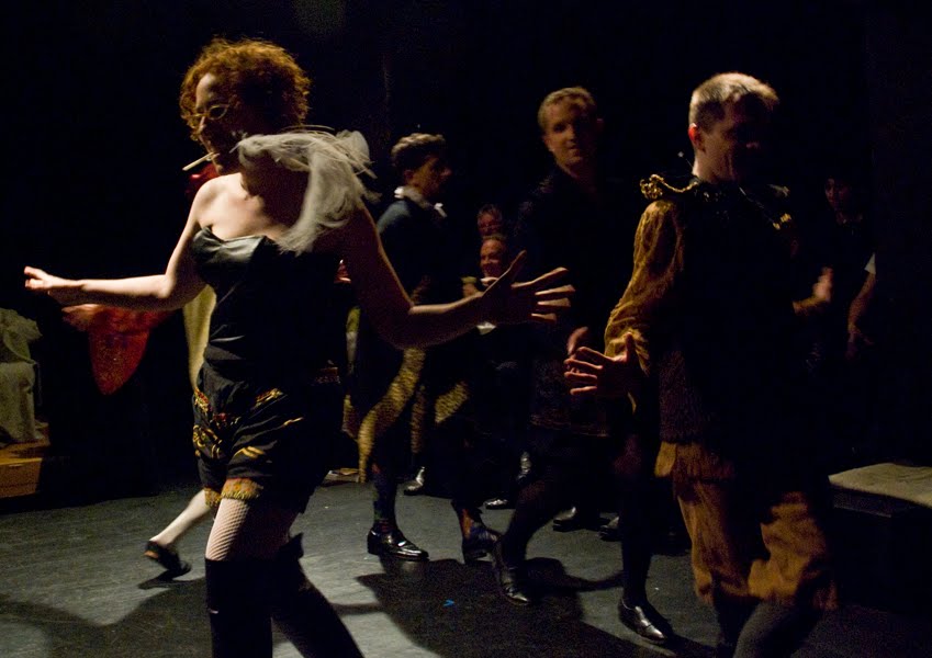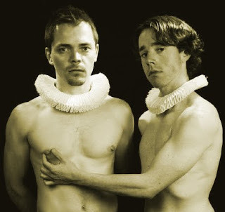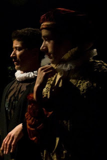 Peabody Award-winning radio host Dmae Roberts interviewed me last week for her "Stage and Studio" program on KBOO. We talked about Shakespeare, growing up in the theatre, and how I got started writing The Lunatic, the Lover, and the Poet. I had a wonderful time meeting her, and really enjoyed our talk. If you missed the show, don't despair! You can download and listen to it at the website here.There's also a new review to report. Margaret Donsbach at HistoricalNovels.info says "The Lunatic, the Lover, and the Poet is a bawdy, madcap riff..." She continues:Not just Hamlet but the other plays of Shakespeare and especially the sonnets are whipped like meringue into this soufflé of a novel: As-You-Like-It-like disguises and misidentifications, Falstaffian tavern-keepers, larks (not nightingales) driving lovers apart at daybreak, and just a hint of tragedy.[...] Even Shakespeare might have approved. The Lunatic, the Lover, and the Poet is an homage to him, although (or perhaps because) the playwright himself is dissolved into a mist of his characters.And, as promised, here are some more pictures from the show at Boxcar Theatre in San Francisco with the GuyWriters. Thanks to photographer Michael Grove for sending these! And thanks again to my brilliantly talented "Ruff Trade Boys" for bringing my novel to life! They are:Aaron Tworek and Brian Martin as Hamlet and Horatio.