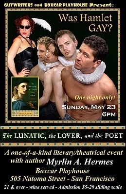 Here's the April 2010 GuyWriters newsletter, with info about my upcoming San Francisco reading. I love the GuyWriters (a fabulous gay men's writing group) and am honored to be their first-ever featured female author! This event is going to be WILD and I hope to see you there!GuyWriters NewsletterAPRIL 2010 - National Poetry MonthIn This IssuePoetry Open MicGay Straight Alliance BenefitThe Lunatic, The Lover, and The PoetJoin Our Writing Groups!GuyWriters hosts three writing groups -- one each for poets, prose writers and playwrights . Led by experienced writers, the groups meet monthly to create and review new work, attend readings, and discuss opportunities for getting your work out to the public. They are a lively and helpful way to advance your writing career. Please contact the group facilitators for more information: Contact:Poetry: Jay Siegel,jjsiegel25@yahoo.comProse: Eric Rose, guywritersprose@gmail.comPlays: Alan Quismorio,alan@asianamericantheater .orgFacebookGuyWriters is on Facebook. Please join us and connect with other gay writers from across the country.GuyWriters will be celebrating National Poetry Month with an open mic poetry reading at Books Inc. in the Castro on April 6 at 7PM. Members of the GuyWriters poetry group will read original work, as well as poems by their favorite poets.Featured reader for the event is Dan Bellm. Bellm is the author of three poetry collections: "One Hand on the Wheel," "Buried Treasure" and "Practice." The reading will begin at 7:30 PM, with sign up for the open mic beginning at 7PM. Everyone that signs up to read will get five minutes. Read some of your original work or share some poems by your favorite poet.Books Inc. in the Castro is located at 2275 Market St. A one night only and only in San Francisco literary event! Guywriters is hosting its first woman writer, Myrlin Hermes, in a literary reading/theatrical event at Boxcar Playhouse, 505 Natoma street, on Sunday May 23rd at 6:00pm.Myrlin has written a brilliant queering of one of the western world's cornerstone works, Hamlet. "The Lunatic, the Lover, and the Poet" is a dazzling piece of reimagined history, and Donald Currie, one of the founders of Guywriters, is directing a theatricalization of passages from the novel, performed by a group of very hot, very talented actors. These scenes from the novel will be woven into readings of the text by Myrlin, who is something of a combination Shakespearean scholar and Lady Gaga. This event promises to be something unlike any literary reading you've ever been to, and is not to be missed.This thrilling world premiere musical celebration of America's first queer activist is written and directed by John Fisher, and stars GuyWriters co-founder Donald Currie.José Sarria started as a drag performer at SF's famous Black Cat Café in the earlty-1950s and rose to fame and popularity as the city's first openly gay public figure. He ran for supervisor in 1961 and went on to form the Imperial Court System as Her RoyalMajesty, Empress of San Francisco, José I, The Widow Norton. SexRev utilizes a non-linear approach to the presentation of Sarria's life, drawing on camp, sketch comedy, and opera parody to tell the story of Sarria's enormous impact on gay entertainment and LGBT politics. Many people don't know that Sarria ran for SF Supervisor a decade and a half before Harvey Milk appeared on the scene; that he has always been at the forefront of gay politics; and that his influence has made possible so much that we accept as basic queer rights. But SexRev is first and foremost an entertainment, an experience for its audience, the wittiest play since John Fisher's Medea, The Musical. The show will run from April 14 to May 2 at Mama Calizo's Voice Factory, 1519 Mission St. between 11th and Lafayette. Visit the Theatre Rhino Website for more information.