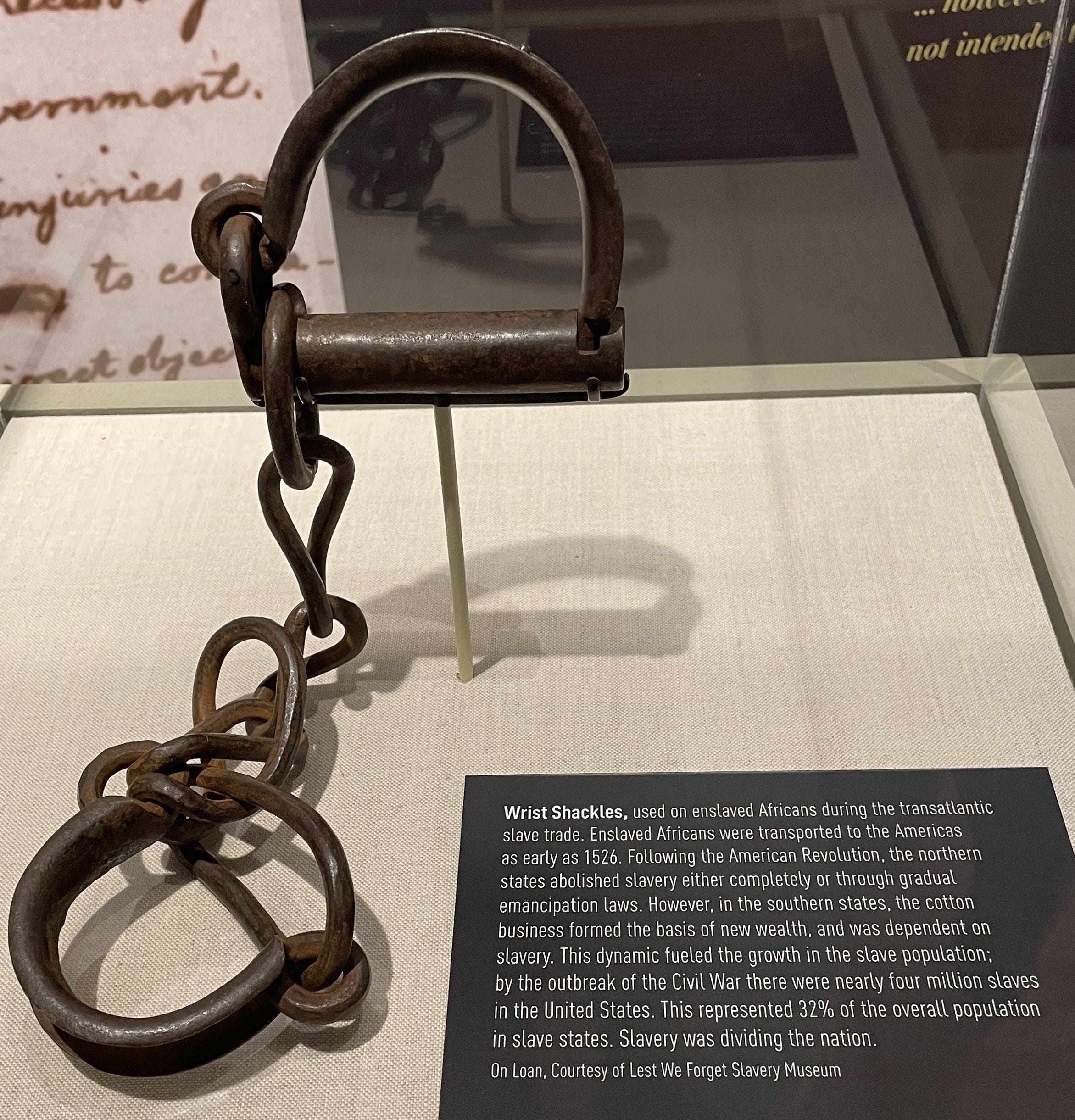 But on a recent follow-up visit to the exhibit, I was pleased to see a significant new addition on loan from the Lest We Forget Museum of Slavery: a display case, positioned so that it can’t be missed at the entrance, containing a set of wrist shackles “used on enslaved Africans in the transatlantic slave trade.” The accompanying label explains how the agricultural economy in the South was based on an enslaved population of 4 million—32 percent of the entire southern population at the outbreak of the Civil War. This horrifically powerful artifact, which doesn’t directly relate to the League itself—an after-thought on the part of exhibit organizers?—connects with Black history like nothing else in the exhibit.