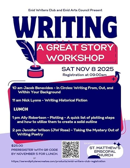 The Enid Writers Club, and Enid Arts Council, present their annual fall writing workshop “Writing a Great Story!” on November 8, 2025, at St Matthews Episcopal Church, 518 West Randolph, Enid, OK 73703. Preregistration is required and it is only $25.