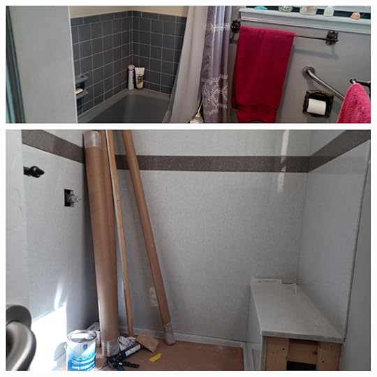 My husband and I decided to take out the tub and put in a shower in the front bathroom. We looked around and got some estimates and decided what we wanted. I am to the point that the less scrubbing the better. I didn’t want grout around tile to deal with. I wanted a smooth finish. And I got it. Well, I will in a few days.