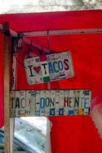 Next he sets up the shelf that sits under the service window with forks and napkins and all the condiments. He has salt, pepper, Tajin, and cut up limes available. The limes are a little expensive, but people love to squeeze them on their food. A little freshness for a fast-food meal consumed in a concrete setting. Lastly, he flicks on the LED sign that boasts “tacos, burritos, enchiladas…” on loop. Every day the same routine, and he likes it like that. Stay in your lane, they say.