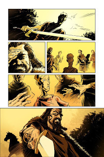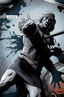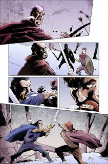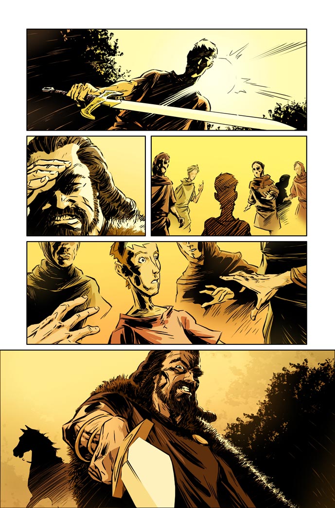 3) A sword, thrown, shunks into the back of the Saxon, wide eyed in his death!