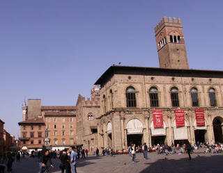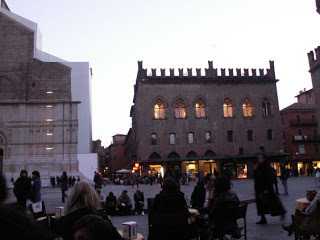 Gegenschuss bei Tageslicht: die Piazza Maggiore inklusive Kaffeehaus.