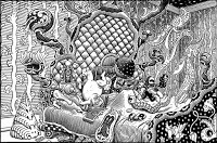Because frogs lend themselves so uncannily to anthropomorphism, and because as Lenny Bruce said on PLAYBOY AFTER HOURS (I'm paraphrasing from memory), "I would never satirize the obvious," it was deemed necessary to keep their actions and expressions as natural as possible within the demands of cartooning; the faces, hands and feet must be expediently expressive, but it can stop there. And so they are not drinking, kissing, dancing, fighting, smoking or doing any of that teddy-bear's picnic stuff. But they are doing something; there is a real event going on here. Up close you hear their breathing and the faint rubbery squeaks made by their jostling hides.
