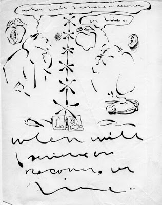 This drawing will give you an idea of the sort of chaos that pounded away at me during the days of mouse-in-the-water. Looking at it I can easily remember the pleasure I felt at getting the upper hand of the situation and dragging into the quotidian world such souvenirs of my exclusive corner of the beloved shining realm. At the time I wouldn't have traded my problems for anyone else's success; though of course I now feel differently, having realized the terrible price one pays for being isolated.