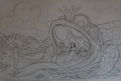 At this point in its development the drawing lost all meaning for me and I could not remember what the point was that I was trying to convey. The girl on the tip of the tongue, the first of her clan to step onto the shore of this new world, was to be bright yellow; her parents brown and bluish. The crown, or exit-wound, shape on the frog's head was to be a translating organ; frogs can only hear the croaks of their own species. There is a pendant drawing of equally delighted people being swept into the frog's mouth. But who wants to see that?