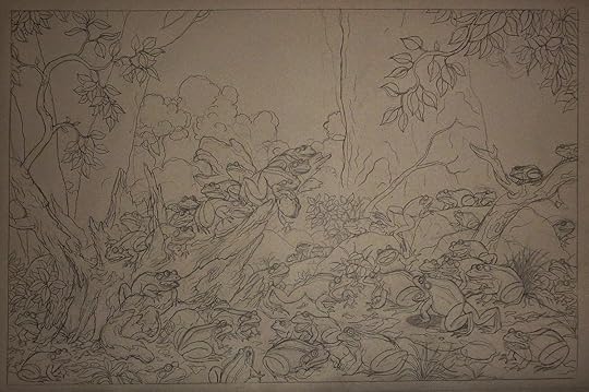 Here is a drawing for a painting of an army of frogs convening in the woods on a moonless night. Viewers will have to peer deeply into the varnish to see the details.
