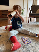 Jack, ferryboat captainThe most fun playing with a three-year-old is their imagination. I recently hung out with our grandson Jack after he broke his leg on a trampoline. Despite his red cast he scooted around the house, rolled, and spun, laughing and narrating his games. The toy I brought him was a familiar kitchen item: an empty paper towel tube. He immediately knew its purpose and over several days put it into action: a sword, a telescope, a stick for his bongo drum. Among Legos it became a house chimney, an airport control tower, then a tunnel for tiny race cars. When he called himself a ferryboat captain I asked if he could see a lighthouse. "Umm ... yes. There!" he said, aiming his spyglass at the dog.