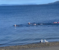 The water temperature was 46 degrees when these Seattle swimmers plunged into Elliott Bay last April. Some wore wetsuits, others were bare armed. Yikes, I thought, as I watched from the beach with these two seagulls.