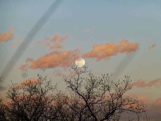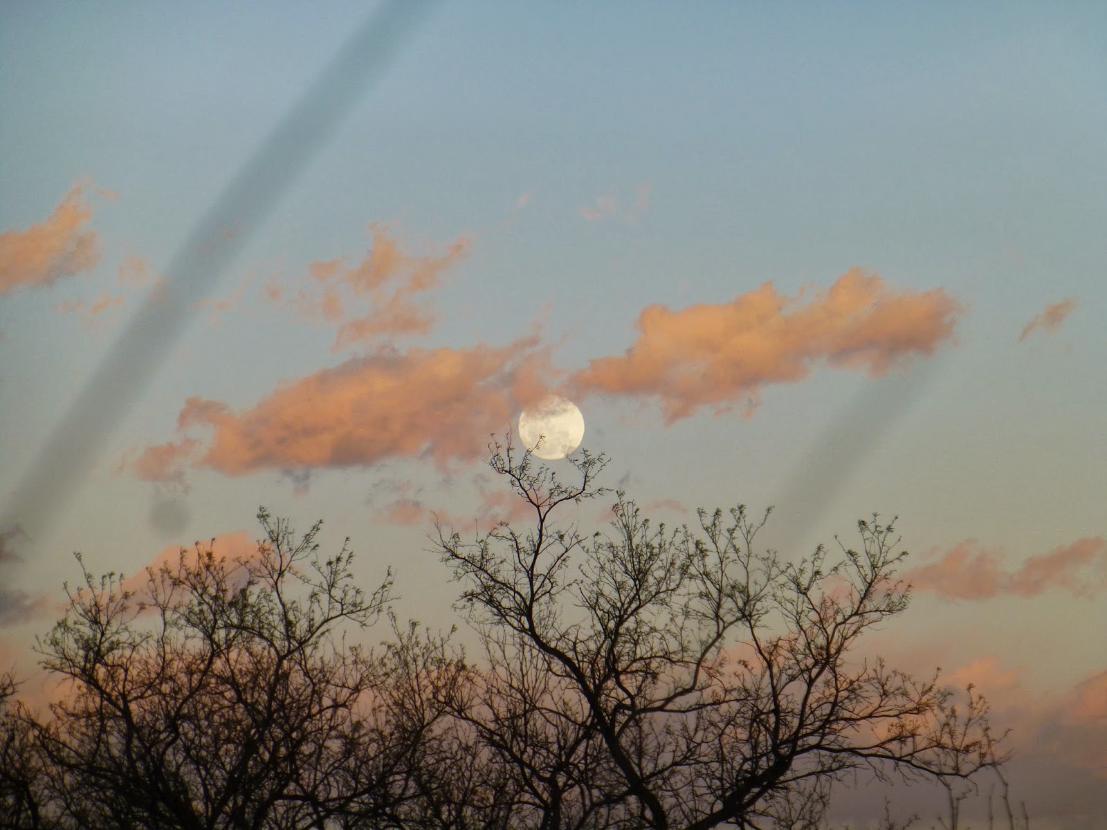 A mesquite tree holds the moon floating in pink clouds