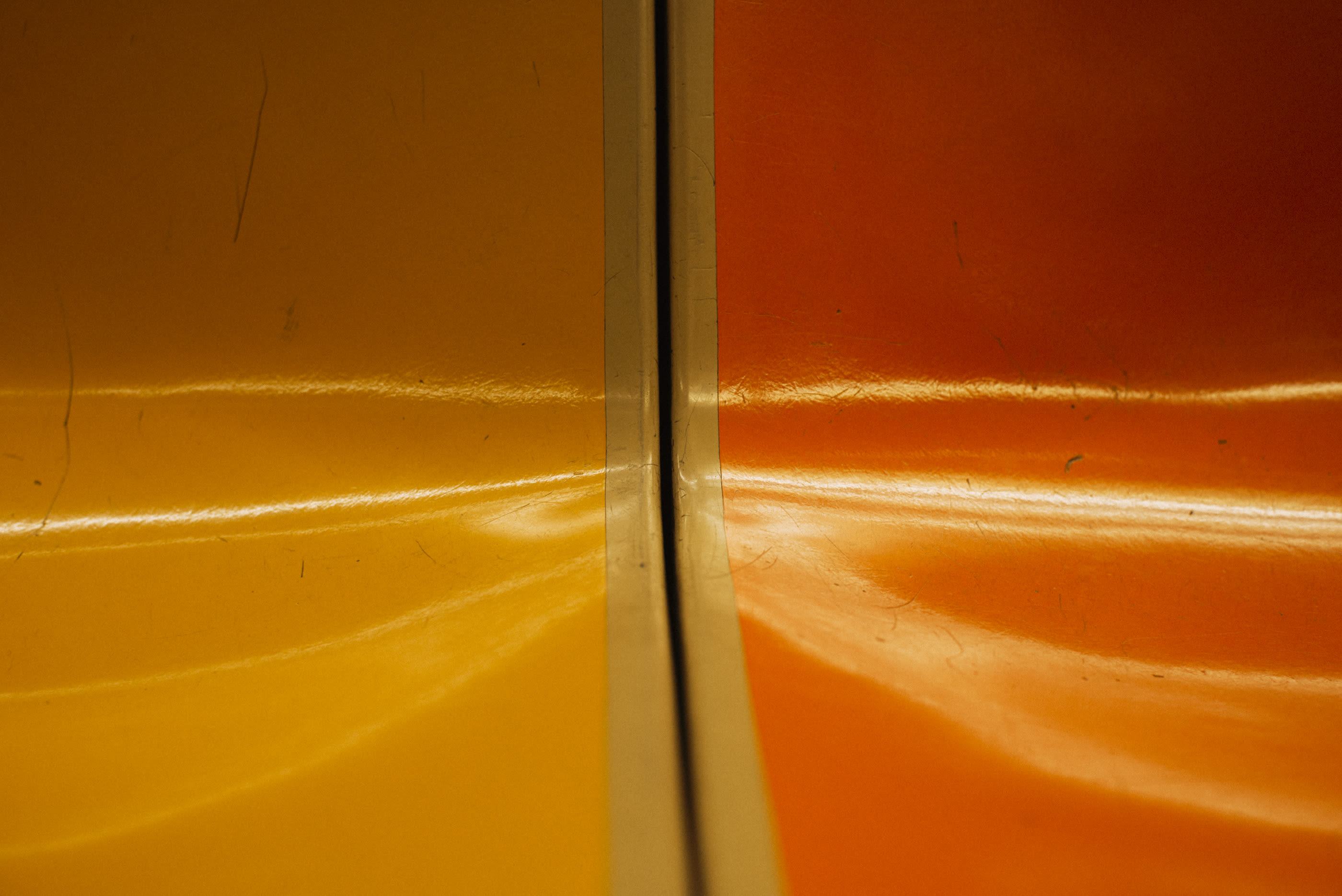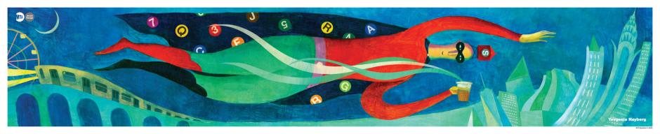 Above the subway car’s rectangular window is beautiful artwork by a Ukrainian artist named Yevgenia Nayberg. One image in particular sticks out: a cartoonish cape-wearing superhero peering out towards The City with its tangled yellow power lines and green treetops and satellite dishes and graffiti building rooftops and worn brick facades and the derelict subway stop just before Crescent Street.