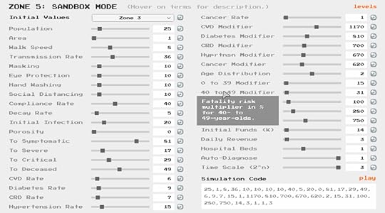 At the time that I posted, I could tell that people were desperately unwilling to enter lockdown for any extended period of time; but “The Hammer and the Dance” strategy of pulsed lockdown periods was still very much in our future. I wanted a mechanic that showed population non-compliance.There was also quite a lot of obsessing over case counts at the time, and one of the things that I really wanted to get across was that our testing was so incredibly inadequate that we really had little idea of how many cases we were dealing with and therefore what the IFR (infection fatality rate) actually was. That’s why tests are limited in the design sketch.I was also trying to get across that money was not a problem in dealing with this. You could take the money value negative because governments can choose to do that. I often pointed out in those days that if the government chose, it could send a few thousand dollars to every household every few weeks for the duration of lockdown. It would likely have been less impact to the GDP and the debt than what we actually did.I wanted names. I wanted players to understand the human cost, not just the statistics. Today, I might even suggest that an LLM generate a little biography for every fatality.Another thing that was constantly missed was the impact of comorbidities. To this day, I hear people say “ah, it only affected the old and the ill, so why not have stayed open?” To which I would reply with: