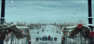 :00 The opening shot shows us a snow-covered hill with people sledding in the distance, and the backs of three people sitting down to watch the action. Lights and evergreen garlands draped on some fencing establish it’s Christmastime.