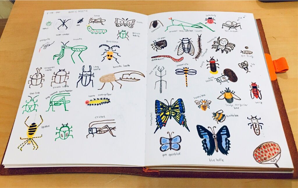 Kata Angie, halaman gambar serangga di atas mirip buku pelajaran biologi (LOL). Saat menggambar kategori ini, saya belajar tentang detail, simetri, presisi, dan memadukan pensil mekanik serta spidol. Happy pas lihat hasilnya. Ternyata saya bisa juga menggambar kupu-kupu dan laba-laba cantik.