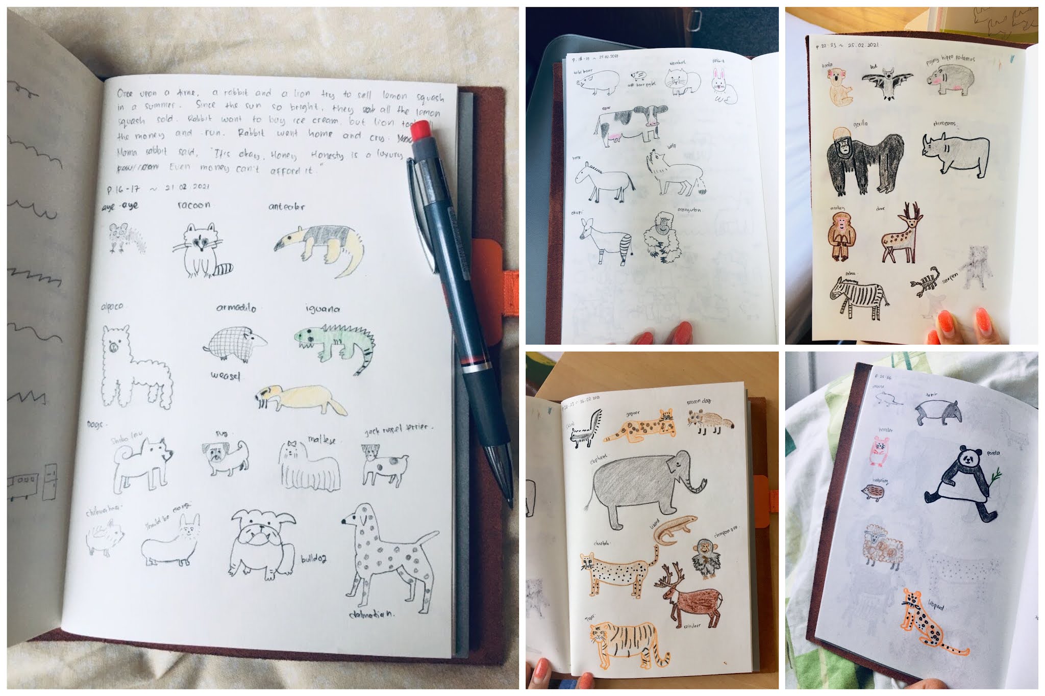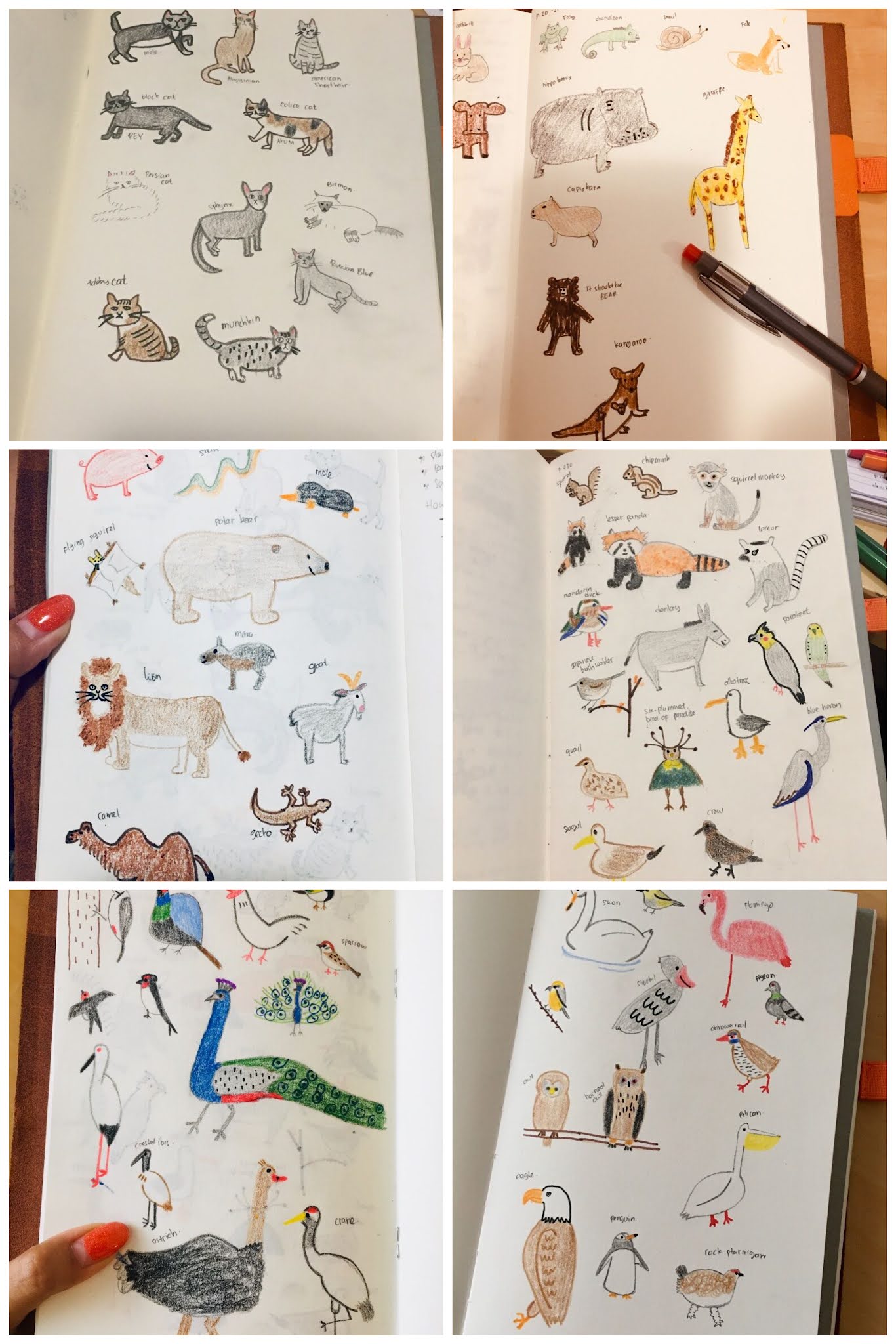 Bulan pertama menggambar, ribet banget cuma bikin garis lengkung atau kuping hewan doang, ya ampun. Gambar-hapus-gambar-hapus, gitu aja terus. Di sini saya menemukan hal menarik, saya selalu membuat garis tegas, cepat, dan ketika tidak sama persis dengan buku tutorial, saya akan kesal dan hapus. Padahal tiap orang, tiap tangan, bahkan tiap waktu, itu kan pasti ada perbedaan. You just need to keep drawing and you’ll see improvement. Kemudian, saya menggunakan teknik garis halus ala bikin sketsa, perlahan, lebih sabar, bahkan mengganti pensil mekanik dengan alat warna langsung supaya lebih hati-hati karena susah dihapus.