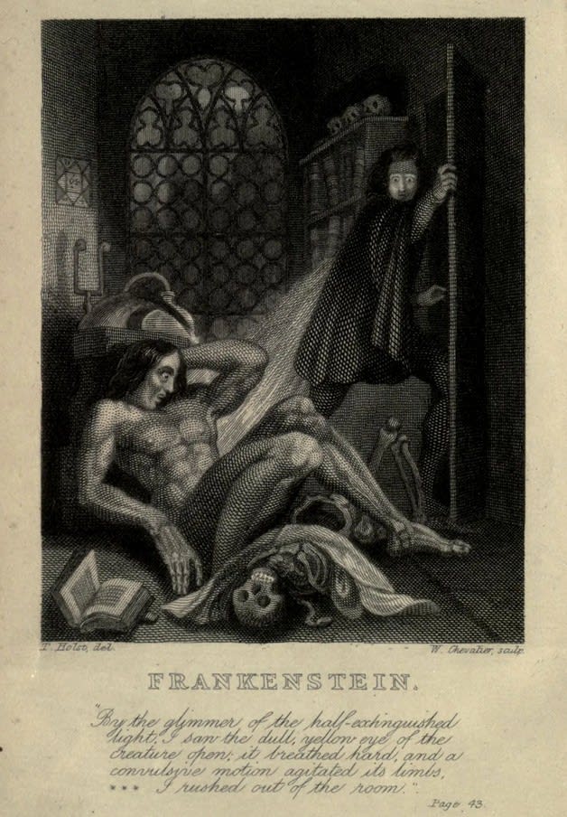 The creator horrified by his own creation. Frontispiece from the 1831 edition of Frankenstein; or, The Modern Prometheus . Illustration by Theodor von Holst.