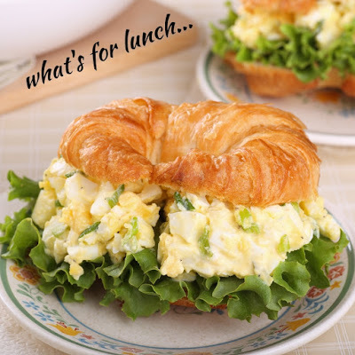 Ideally, I'd love it with chicken salad, but...egg salad is almost as good. (With minced celery and chopped olives--and LOTS of mayo. I've found the best olive oil mayo is actually Walmart's Great Value brand. Costs less than the big brands and tastes better. Has almost half the calories of regular mayo, too. Commercial over.) I have just enough lettuce to put on the croissant, too. (Boy, have I been nursing this head of lettuce.)