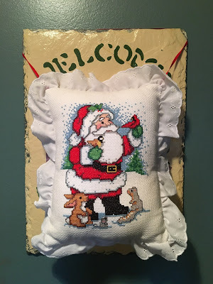 I did some more decorating over the weekend. I'm running out of doorknobs and wall space to hang things, so this Santa pillow is now hanging from the welcome sign just inside my front door. I did the cross stitch back when my hands could take it, and my mother made it into a pillow with a ribbon. I used to hang it on the handle on the handle from the sliding glass door into our enclosed porch, but then my sister-in-law sent us a felted stocking (which is pretty) and it's lived there every holiday season since and Santa got relegated to storage, but I like it and decided to try to find a way to use it. Mr. L's sister is an extremely talented knitter and makes the best stuff. (I'll have to take pictures to share.)