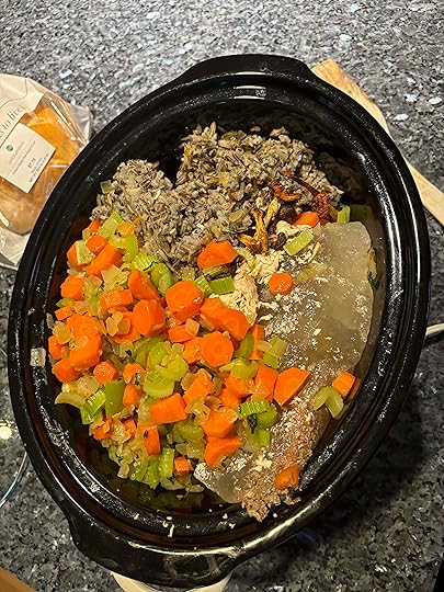 Stick veggies and herbs in a crock pot along with a carton of broth (or the Ziploc block of homemade stock in your freezer if you're a weirdo, Depression-era-style cook like me who doesn't let bones to go to waste). Salt, pepper, and toss in leftover rice or a packet of noodles (it's wild rice for me today).Next, add a packet of dried mushrooms (I keep some around for just this reason) or diced up, left over meat, including bacon (but cut it microscopically small; big chunks of meat in gloup is considered gauche).