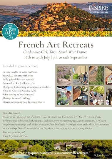 Inspire Creative Retreats2026Art Retreats in Southern FranceHello! Just to let you know, following the success of my wife's art retreat earlier this year, she's now offering two retreats in Southern France.Hosted at a luxurious private villa in the medieval town of Cordes-sur-Ciel. You will be treated to a wonderful week of art, gourmet French food, and wine. Check out the retreats and book here: https://www.inspirecreativeretreats.com/2026-retreats
