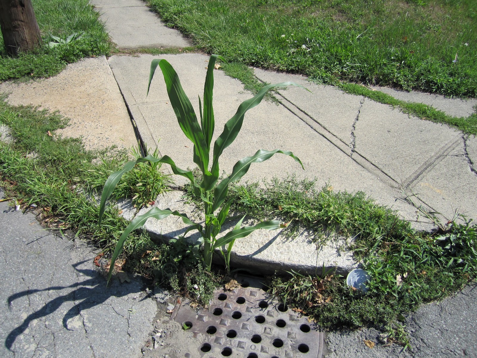 It's actually pretty tall. It is growing up through the vent and that fuzzy thing that pops out of the top of really tall cornstalks is just making it's appearance. I estimate several feet of stalk well below the grate. NYC grows alligators, but upstate, we are more tame, and sustainable.