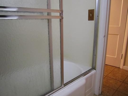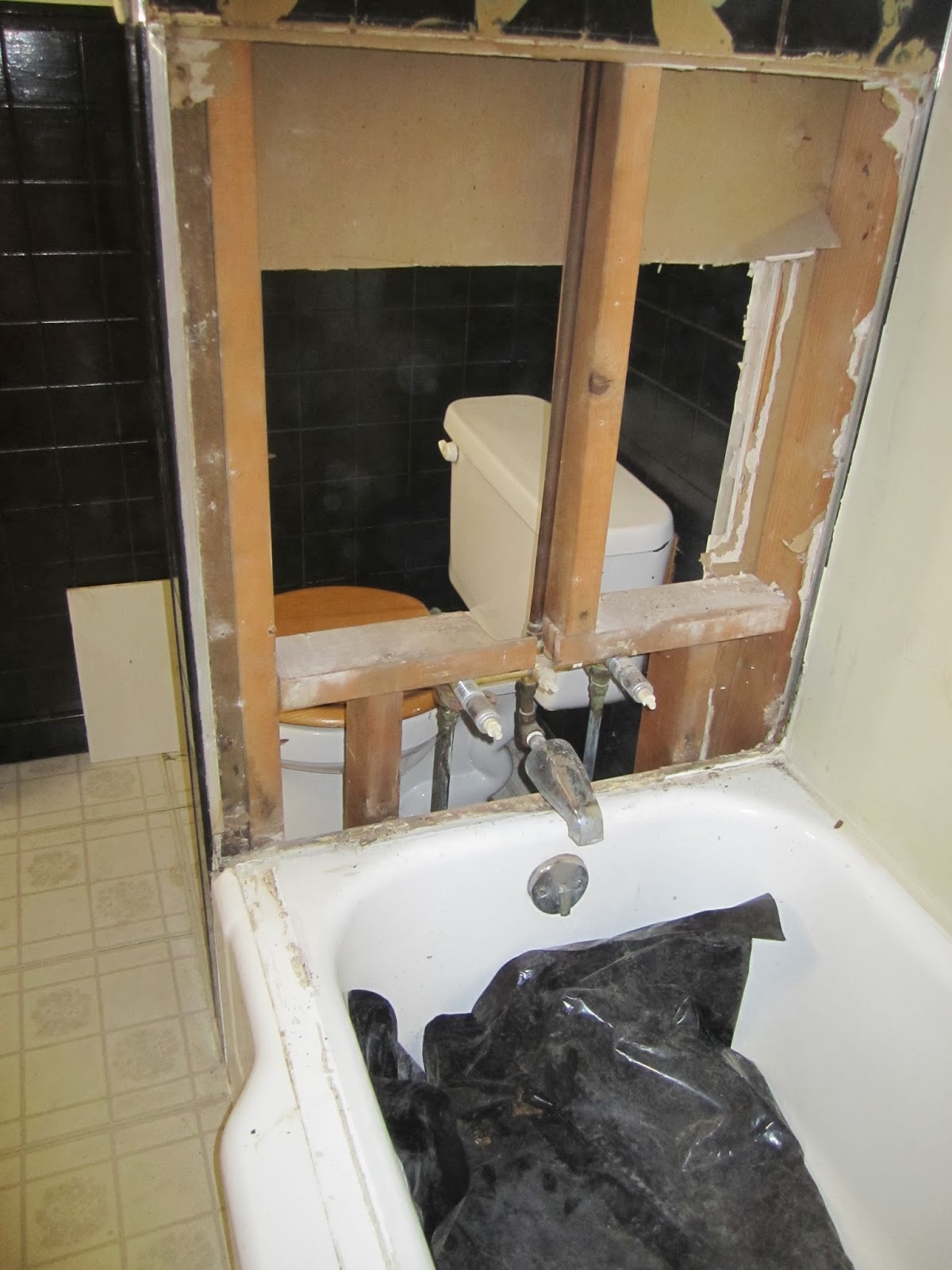 By the way, this is now the wall opposite the light switch in the bathtub enclosure. A similar fate shall soon befall the other walls as some order gets restored, and the electric gets moved to a less dicey region of the bath.
