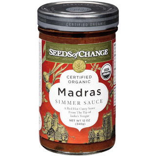 The main ingredient is Seeds Of Change Madras Simmer sauce (which by happy coincidence is organic and lower in sodium than many other curry sauce alternatives). I discovered this at Fresh Market and tried it on a lark and discovered that alone it's pretty tasty, but when jazzed up with a few more select additions, it really took flight. Plus it makes curry a fast affair that mimics scratch made. This serves 4 adults and more if you add more veg to the mix. I have found it in local food co-ops, in healthfood stores, and speciatly grocers like Fresh Market. If you can't find it local, try on-line. Even WalMart.com sells this little jar of wonderful.