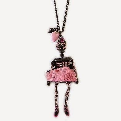 I adore her jewelry. It's quirky and weird. Kinda like me. I collect it, but I don't like to pay a lot of money for costume jewelry. You can usually find Betsey at a great price at Nordstrom Rack. Or, this is what I do. I put the piece I want on my wishlist at Amazon. Generally it will go down in price within a month or two following that. So I keep an eye out and if it goes down (sometimes a $60 piece will get marked less than $20) I grab it. I don't like to pay a lot for the fun stuff. And I'm collecting the skeleton girl necklaces like the one above (which my daughter gave me for Xmas last year—score!).
