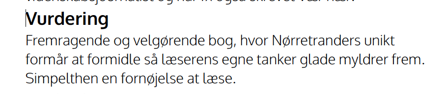 “Fremragende og velgørende bog, hvor Nørretranders unikt formår at formidle så læserens egne tanker glade myldrer frem. Simpelthen en fornøjelse at læse.”