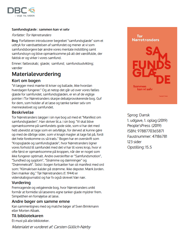 Så smukt lyder en “Vurdering” af bogen “Samfundsglæde”. Udsagnet er en slags konklusion en lektørudtalelse, også kaldet materialevurdering, fra DBC, Danmarks Bibliotekscenter – en afgørende vurdering af en bog, fordi den danner grundlaget for bibliotekernes beslutning om indkøb og i øvrigt er den eneste betydende form for anmeldelse, der ikke kommer fra et kommercielt medie. “Et must på alle biblioteker”, lyder dommen.