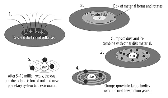 Rocky planets like Earth form via a process called core-accretion (see image below). As a giant gas cloud collapses to make a solar system, the star forms at the center while the rest of the material falls into a disk orbiting the star. Within the disk, ice and dust begin clumping together to form larger objects, eventually growing large enough to attract other pieces of ice and dust as well as other clumps. Then the larger clumps continue to grow larger and the smaller clumps either break up or join the larger clumps. The last step of the planet-formation process includes an epoch where the large planetesimals (forming planets) collide with one another and the planets clear out all the dust, ice, and remaining material in their orbits.