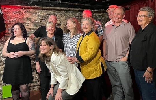 The readers at Noir @ The Bar, from left, Katie York, Kate Flora, Chris Holm, Barbara Ross, Jule Selbo, Bruce Coffin, Matt Cost, Paul Doiron and me, with Gabi Stiteler, who was the moving force behind organizing the Friday night event, in front.