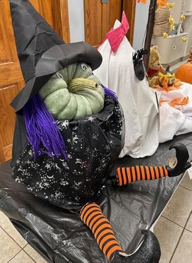 The witch’s face was a green pumpkin turned on its side so the curved stem was a nose. Of course she had a black pointed hat above her glued-on eyes. Purple hair flowed down over a black metallic body. Protruding from the black body were hilarious orange and black-clad legs with pointed-toe black feet ready to kick. That witch looked ready to leap from the table but she was too funny to be scary.