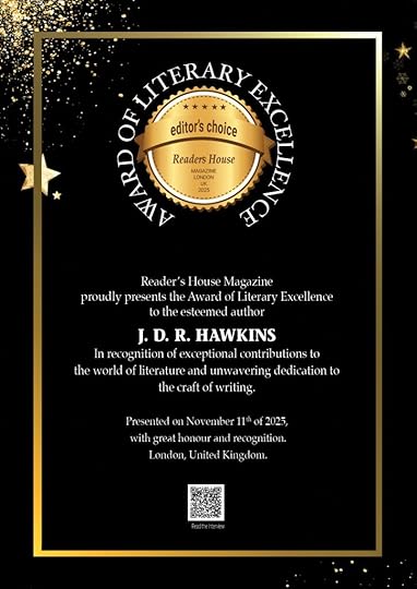 Last week, I received the Award of Literary Excellence given by Reader’s House Magazine. This is a prestigious honor, and I am very humbled to accept it.