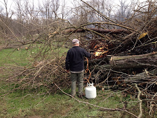 My most recent close call happened at my brothers’ farm. We had been piling up old logs and branches from the river for burning. The piles were about twelve feet high and sixty feet across. Starting the burn was no problem, with enough diesel fuel and a propane torch. Here's a brother at work.