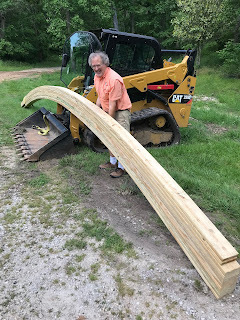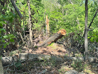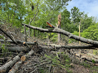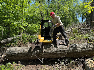 I visited my brothers' tree farm in Missouri last week, in time to help clear storm damage by operating their Cat skidsteer. Storm: as in a likely F1 tornado in early May that toppled many dozens of big trees on their property. First priority was to open the roads, followed by salvaging hardwood saw logs.
