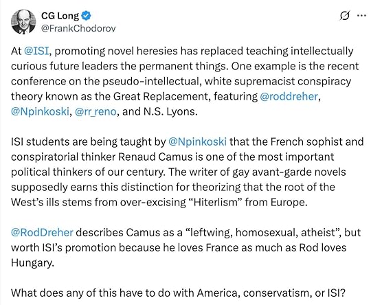 Nathan Pinkoski, lecturing at ISI on Renaud CamusYesterday C.G. Long tweeted an “Open Letter” from two former ISI presidents (including himself), who smeared Patrick Deneen and ISI president Johnny Burtka for supposedly betraying conservatism. Today it’s my turn (with others) to receive the Long lash: