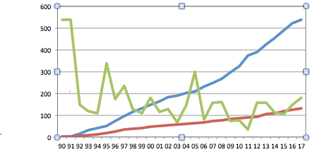 [image error] The chart at right shows the arc - the blue line representing the cumulative number of files worked on and the red the cumulative number of stories sold year by year (I haven't included sales of reprints, audio productions, or donated stories.) The total number of unique sales is 137 (ffive in 2018) and the cumulative number of files is just 559. This makes my "lifetime" sales average 24.5%, a full tenth of a point increase! The green line is the ratio of sales to files each year, which seems to be smoothing out as the number of works increases.