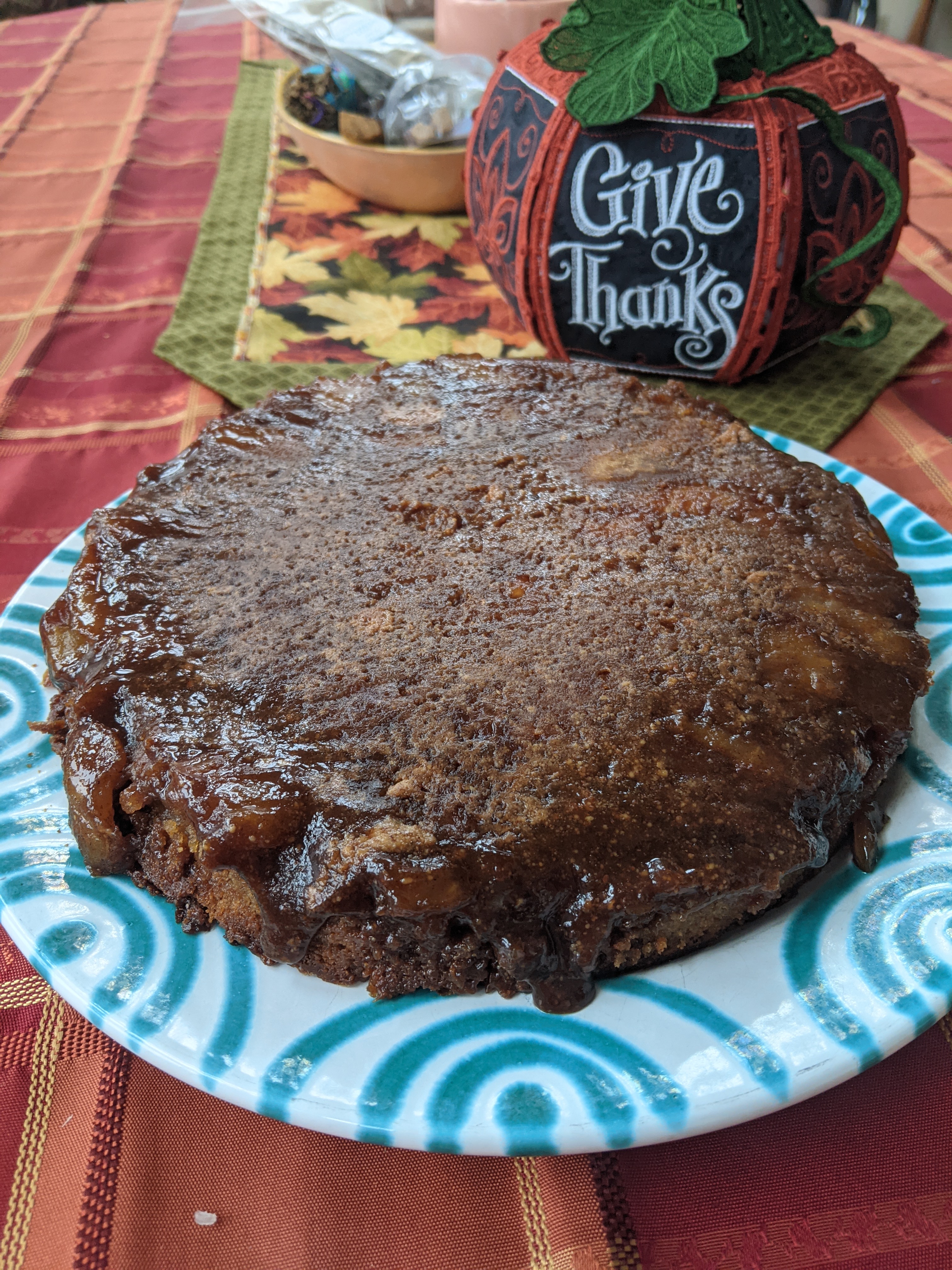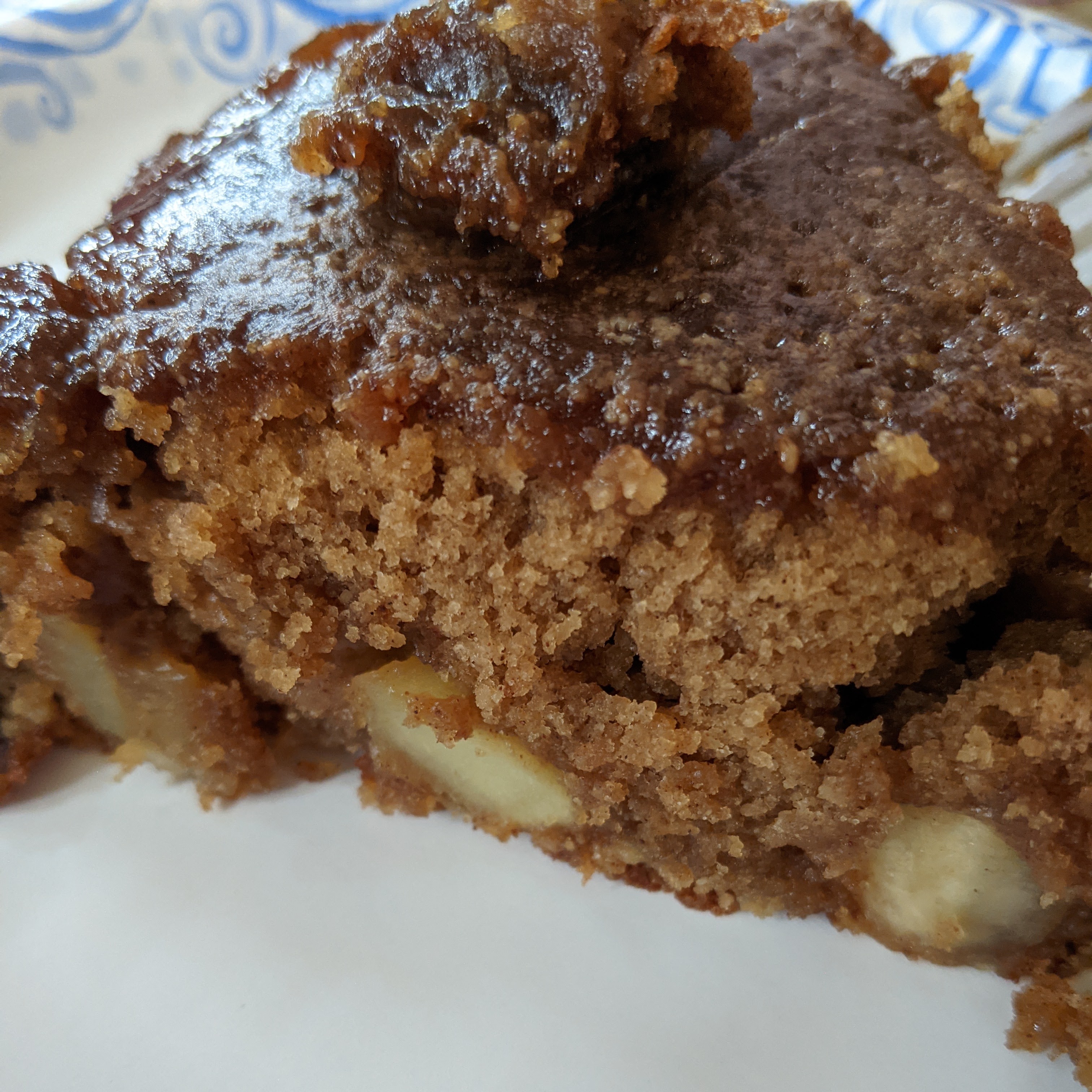 Mix all ingredients except butter. When combined place into well greased and parchment papered cake pan. (I placed a circle of parchment paper in the bottom of the pan, greasing on both sides of the paper and the rest of the pan. Cut butter into small pieces and dot across the Apple mix. Set aside.