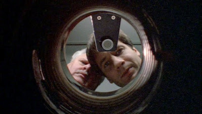 Much more intriguing than the mean girls, however, is the way that Carter uses the idea of the “syzygy” in regards to Scully and Mulder. In this episode, the couple encounters a "third body" in the form of the (hot...) Detective White, and the new alignment immediately throws off the familiar relationship. Rob Bowman, the episode's director also deserves kudos for his sterling compositions in the episode, which often reinforce how the presence of a "third" body (White's) sends Mulder and Scully spinning into erratic orbits. Just look at the framing below and you'll get a sense of what I'm talking about: