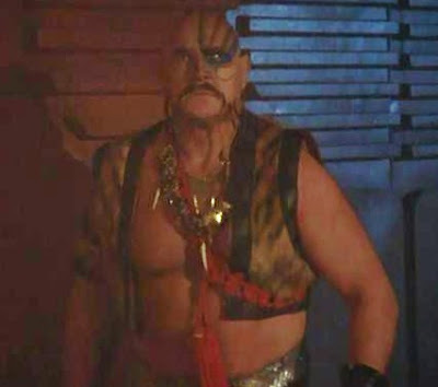 Make-up, costumes and props from Galactica also materialized with regularity. The alien "Boray," the focal point of the Galactica episode "The Magnificent Warriors," was seen in the BR episode "Unchained Woman," and Colonial fatigues, also BG hand-me-downs, were utilized as the uniforms for Roderick Zale's henchmen in "Cosmic Wiiz Kid." This oppressive re-use of Galactica equipment, effects, make-up and sets, along with the frequent editing glitches, often made the future depicted in Buck Rogers appear cobbled-together, cheap or just unimpressive.
