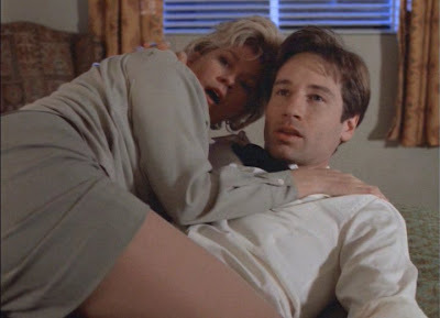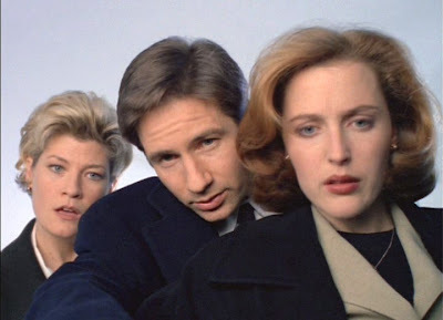 Three bodies in alignment or conjunction? Or are they out of alignment?If we return for a moment to the second definition of "Syzygy" -- the psychological conjunction of two people taking on opposite sexual characteristics -- the episode becomes even more intriguing. I’ve written about this aspect of the series before, and David Duchovny has also publicly mused on the subject, but in many ways, the sex roles of Mulder and Scully on The X-Files are reversed. Scully is much more analytical and closed-down emotionally (which are stereotypically male characteristics), whereas Mulder is more open and questioning (stereotypically female characteristics).