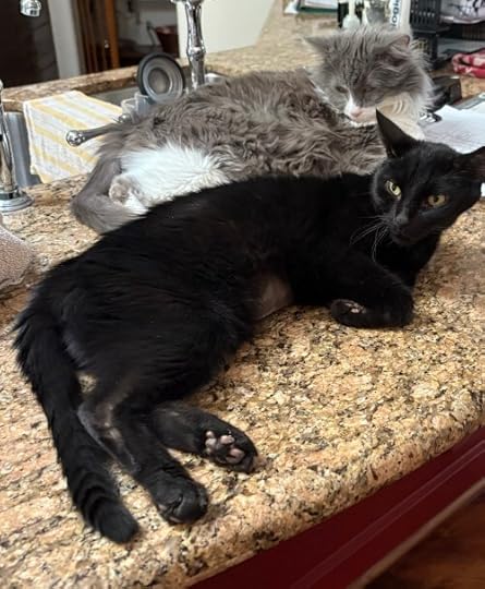 Meesker, the other one of my son’s cats. He’s shy and was bullied by Lily for years, so for the last couple of years he’s lived in the back of the house with Sloopy Anne. However, just recently, he decided he likes it out front with Perry. Lily doesn’t dare bully Meesker out here because Perry keeps her in line. Perry is the benevolent king. Meesker is so skinny (GI issues) that he slides between the bars of the gate we put up so he can come and go as he pleases. (Actually so can Perry when he really really wants to do it). All black with black whiskers and toe beans.