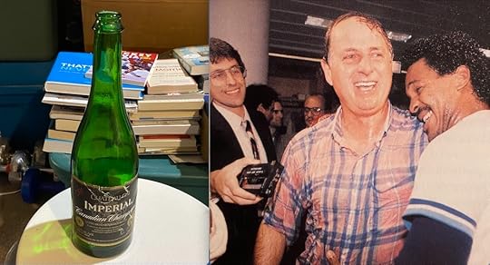 I still have a champagne bottle (empty) that I took from the Blue Jays clubhouse at Exhibition Stadium after the 1985 celebration. It’s currently among the boxes of Blue Jays items from over the years that are being stored in Jonathan’s basement. And that’s me, in the clubhouse again at Skydome in 1989 while working for Digital Media, holding a tape recorder in front of Blue Jays GM Pat Gillick and George Bell.